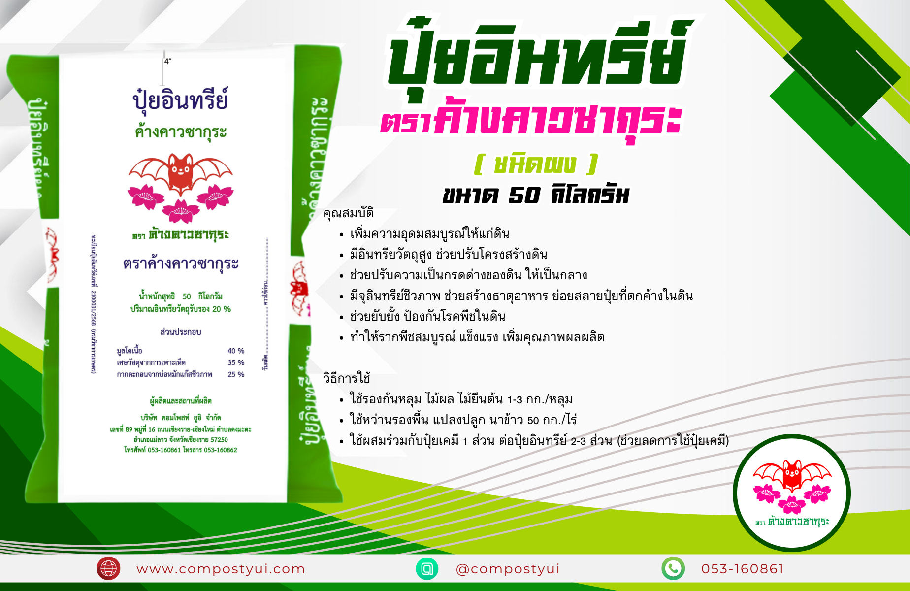 ปุ๋ยอินทรีย์ ตรา ค้างคาวซากุระ ชนิดผง คุณสมบัติ : - เพิ่มความอุดมสมบูรณ์ให้แก่ดิน